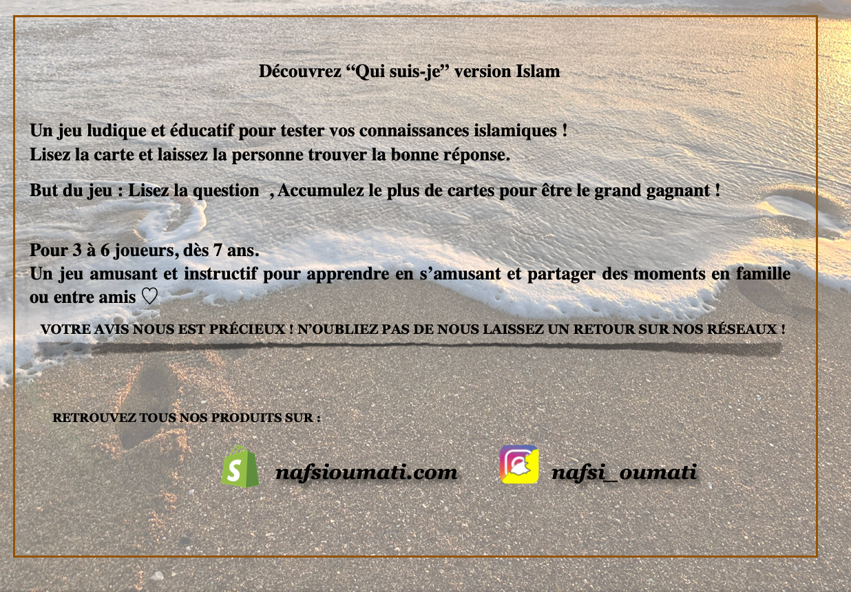 Qui suis-je ? est un jeu de cartes islamique pensรฉ pour toute la famille. Grรขce aux indices, fais deviner le personnage piochรฉ et plonge dans lโunivers de lโislam de faรงon amusante, รฉducative et conviviale.